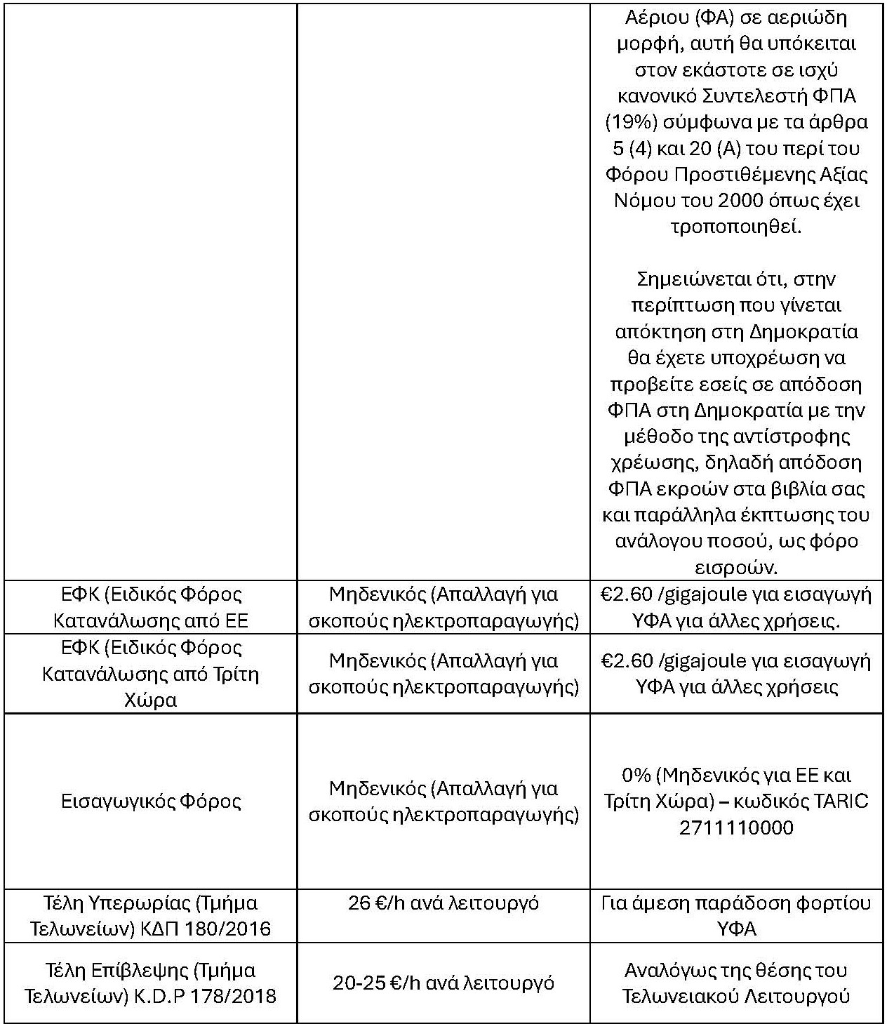 Tα Εθνικά Τέλη και Χρεώσεις για το ΥΦΑ και το ΦΑ που θα εισάγεται στη ΚΔ τόσο από Κράτη Μέλη ΕΕ όσο και από Τρίτες Χώρες παρουσιάζονται πιο κάτω.